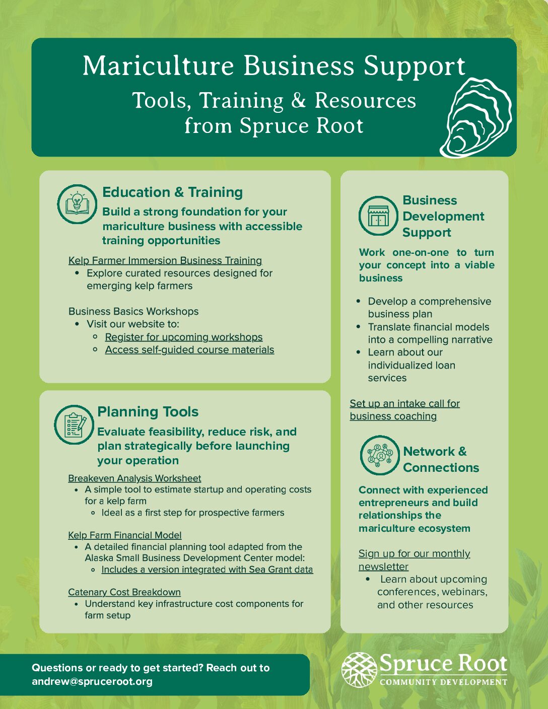 Through its partnership with AMC, Spruce Root offers education and training, planning tools, business development support, and networking opportunities. Its Education & Training program includes a Kelp Farmer Immersion Business Training and Business Basics Workshops, both of which offer curated resources for new kelp and oyster farmers and processors.