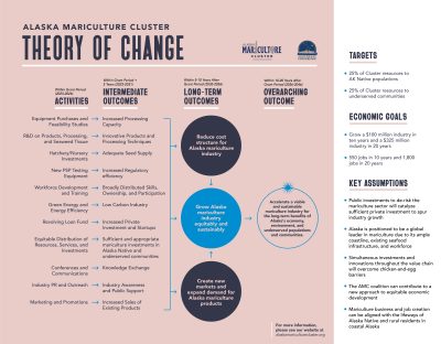 Through initial engagement efforts and building on AMC grant’s Overarching Narrative, Ecotrust and Southeast Conference collaborated to produce the AMC’s theory of change, which illustrates the coalition’s vision for accelerating a viable and sustainable mariculture industry for the long-term benefits of Alaska’s economy, environment, and communities.