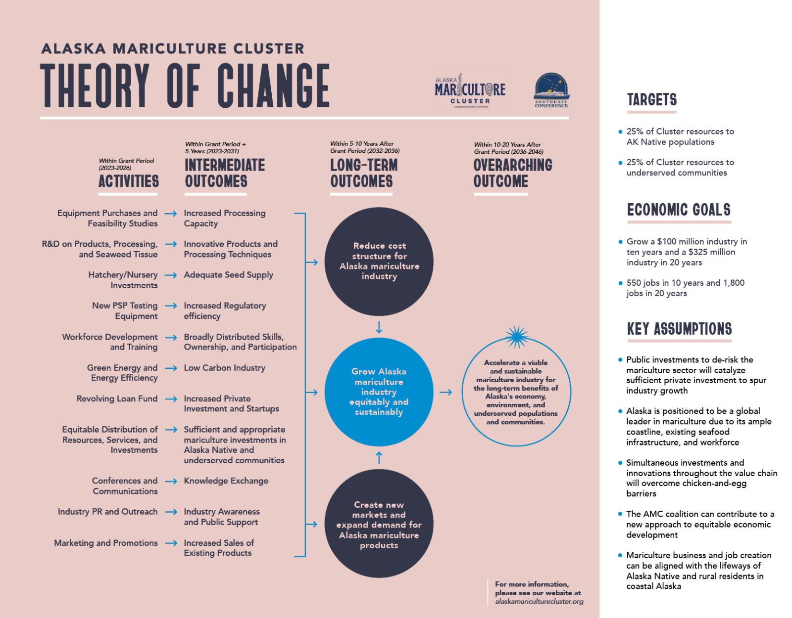 Key assumptions in the AMC’s theory of change include the belief that strategic investment in infrastructure, workforce development, and market access will significantly lower barriers to entry in mariculture. Additionally, fostering collaboration among industry members, Tribal entities, and agencies is expected to create a more resilient and inclusive industry.