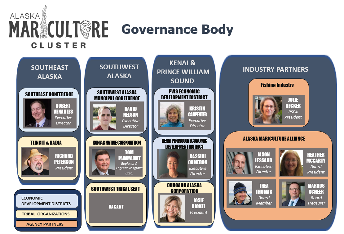 The Governance Body’s role is to ensure equitable implementation of the AMC grant, providing support and equal access to resources offered by the grant, and oversight of the development of the mariculture industry. The Governance Body will also monitor progress on project outcomes, as well as regularly evaluate participation of underserved populations and communities. The Governance Body is comprised of the four Economic Development Districts (EDDs) within the project regions, four regional tribal representatives, four board members of the Alaska Mariculture Alliance (AMA), and one member from the Alaska Fisheries Development Foundation (AFDF). Each regional EDD is responsible for conducting outreach to industry and interested parties in their regions.