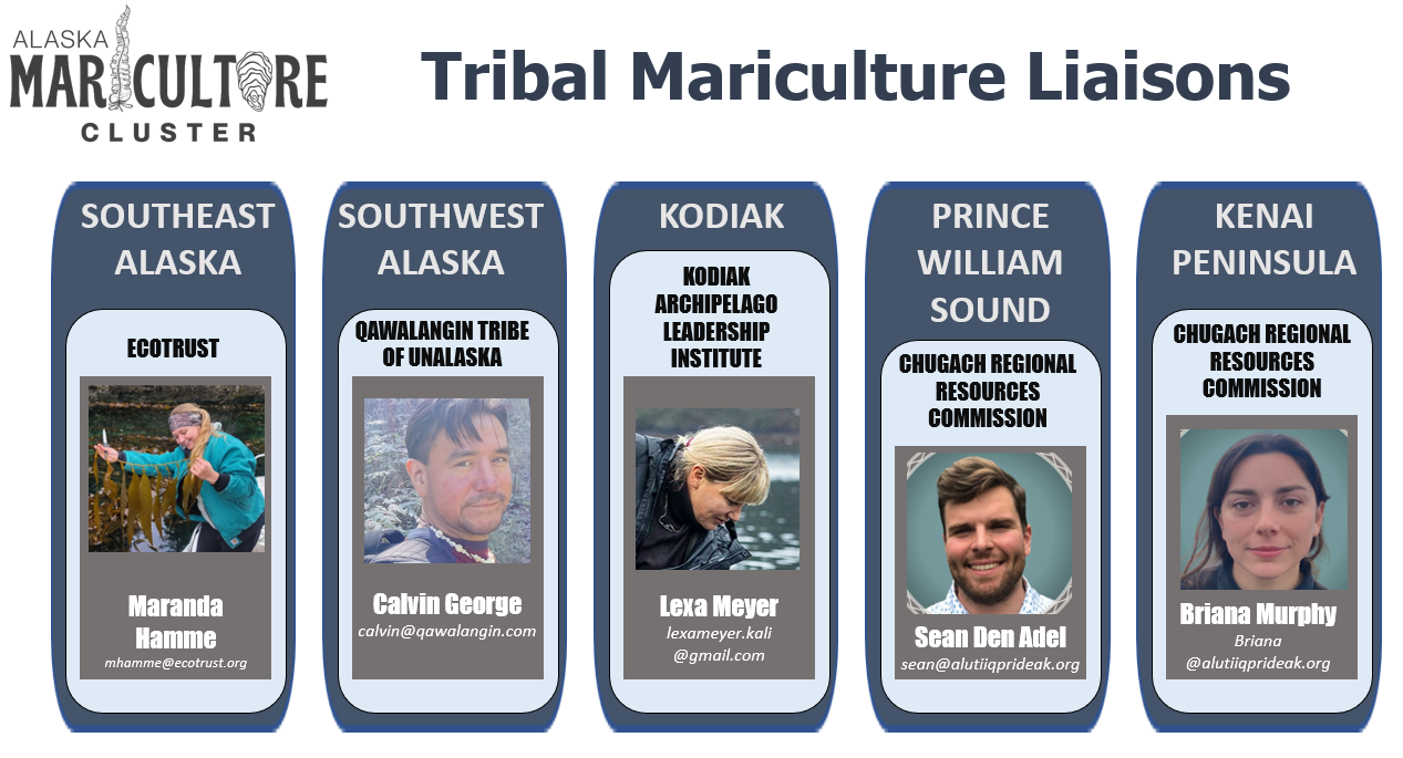 The Alaska Mariculture Alliance (AMA) has contracted with regional Alaska Native-focused organizations to host dedicated Mariculture Liaisons to provide communication, connection, and coordination services to underserved, rural, and Alaska Native communities. The Mariculture Liaisons facilitate access to resources within the AMC grant and generally support mariculture development efforts that meet local and Tribal priorities.