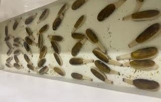 This project seeks to develop reliable hatchery and nursery methods for razor clams, a once-abundant species in Alaska that has declined sharply in the wild and lacks a hatchery seed source. Building on earlier work at APMI and UAF, the project is focused on broodstock conditioning, larval rearing at commercial densities, and nursery grow-out procedures that could eventually support both restoration and commercial farming. Broodstock collection efforts in Prince William Sound produced only 20 clams with no successful spawns, while collections in Lower Cook Inlet yielded more promising results. From 105 clams collected, two successful spawning events were achieved, producing an estimated 400,000 juveniles averaging 1.2 mm. Several challenges emerged, including high mortality of broodstock during transport and culture, limited numbers of viable females, and variability in egg fertilization success. Nonetheless, one combined spawn was successfully reared through a 19-day larval stage to settlement, with approximately 275,000 juveniles surviving to be transferred into sand-based settling bins for further grow-out. With refinement of broodstock handling, spawning, and larval care, the project aims to generate repeatable protocols and establish Alaska’s first consistent source of razor clam seed. If successful, this effort could provide new opportunities for shellfish farmers and support ecological restoration where razor clam populations have collapsed.