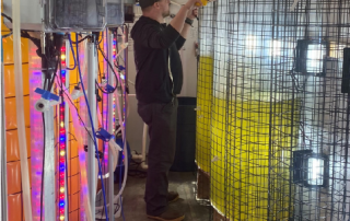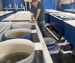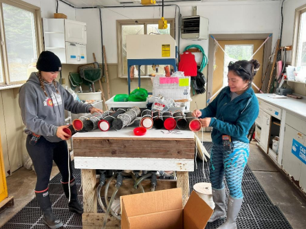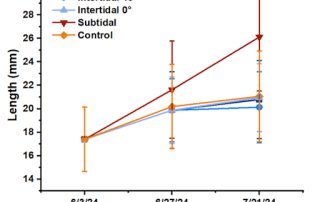 This project aims to determine how abiotic hatchery conditions, specifically temperature and light, affect bull kelp growth from the microscopic stage through to farm harvest, while also evaluating cost and energy tradeoffs. Initial hatchery trials showed that high temperatures accelerated early growth but caused juvenile sporophytes to detach before outplanting, while lower temperatures produced steadier growth with less contamination risk. Higher light levels also appeared beneficial, though data analysis is ongoing. Once seeded lines were deployed, almost all bull kelp washed off within a month, preventing harvest-level comparisons. This prompted additional investigations into environmental and hatchery-related causes of seed loss. The team is now testing whether unusual winter conditions (warmer, rainier, cloudier weather in 2024–25) or hatchery practices (low water motion and frequent GeO₂ additions) contributed to poor seed adhesion. Follow-up experiments in Kodiak are underway using varied water velocities and GeO₂ treatments to evaluate adhesion strength. Despite setbacks, early findings suggest lower hatchery temperatures (~5°C) may improve farm yields, though further replication is needed. A no-cost extension is being sought through June 2026 to repeat trials, confirm results, and strengthen conclusions about how hatchery conditions influence farm-scale bull kelp production. If successful, the project will provide kelp farmers with data-driven hatchery protocols to improve survival, yield, and cost-efficiency.