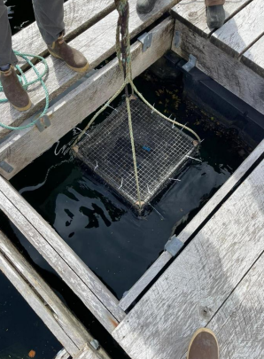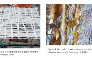 This project addresses a key challenge in kelp farming: the lack of data on how bull kelp buoyancy changes over the growing season, which complicates the design of cost-effective anchoring systems. The study deploys seeded crab pots suspended at 10 m in Prince William Sound, monitoring kelp density, morphology (bulb size, stipe length, biomass), and overall buoyancy, alongside oceanographic data from instruments such as a CTD, temperature loggers, and an acoustic doppler current profiler (ADCP). Early results from the first season show slow kelp growth and declining densities, likely linked to nutrient limitations, as well as biofouling issues. Technical challenges, such as corrosion of stainless-steel mesh, were mitigated by switching to more durable materials. While buoyancy changes have not yet been detected due to small plant size, the study is generating valuable environmental insights into growth conditions and farm infrastructure needs. The team is considering a second growing season to strengthen results, while planning to complete data collection, analysis, and dissemination by the end of the project cycle, with findings expected to guide the engineering of anchoring systems for bull kelp farms.