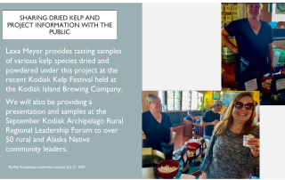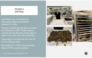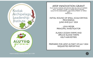 This 12-month project tests forced air drying and milling as scalable methods for the primary stabilization of farmed kelp, addressing a critical need for post-harvest processing solutions in Alaska’s coastal communities. Trials are being conducted at the Kodiak Seafood and Marine Science Center (KSMSC), with data collected on drying efficiency, economic feasibility (energy and labor costs), and the quality of dried kelp (nutrient content, heavy metals, microbial levels, water activity). Early progress includes installation of a new dryer and hammer mill, drying ~100 lbs of bull kelp into ~11 lbs of dried product, and preparing samples for nutritional and microbial testing. Budget adjustments are planned to expand testing to additional kelp species (dragon kelp and split kelp), include fertilizer analysis, and trial a pre-drying water reduction step with a pneumatic screw press. Community engagement is central: Alaska Native farmers from Ouzinkie participated in harvests for trials, and outreach is planned through demonstrations, workshops, and a “taste and tell” event at the Kodiak Archipelago Rural Regional Leadership Forum. The project is on track to finish on time and use all funds, with results expected to guide practical small-scale drying and milling systems for kelp farmers across Alaska.