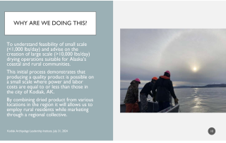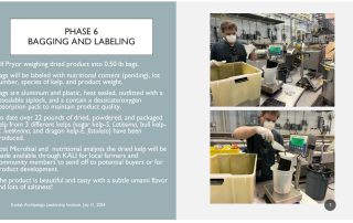 This project explores efficient primary processing methods for kelp at the community hub or small farm collective scale (10–30 acres) to better align production with local infrastructure, products, and markets. Building on prior work and partnerships with APMI, the University of Alaska, and Salmon Sisters, the team has tested stabilization techniques including drying in a modified high tunnel, salting for food preservation, and fermentation to create plant biostimulants. More than 3,000 pounds of kelp were processed, with inputs tracked and samples sent for nutrition and safety testing. Community engagement included tours and workshops with Native communities in Port Graham and Nanwalek, while collaborations with Salmon Sisters expanded value-added sales through retail and e-commerce. All dried kelp was sold, and test batches were run with larger drying systems (Beltomatic) to evaluate scalability. Next steps include trials with an IR dryer, further data analysis, and developing recommendations for scaling small-farm processing. The project is on track, with all funds expected to be used, and demonstrates how diversified stabilization methods can both enable scale-up and open new market opportunities for Alaska’s mariculture industry.