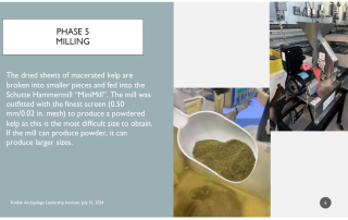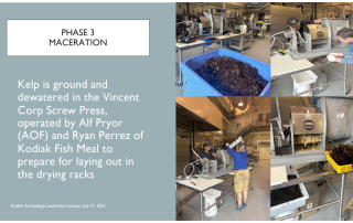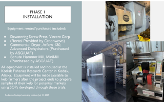 This project addresses the challenge of kelp stabilization in rural Alaska, where high energy costs, limited labor, and distance to markets hinder farmers from selling dried kelp—the most common global form of seaweed trade. The goal is to identify and test cost-effective drying methods suited for small-scale farms and community-level processing, producing public reports on equipment, costs, and feasibility. Progress to date includes compiling a global kelp drying report that summarizes methods, costs, and supplier contacts, helping farmers independently evaluate options. Early testing with screw presses showed that mechanical dewatering is not practical for producing dried kelp. Challenges included shipping costs and limited local access to large equipment. Next steps will involve testing other small-scale dryers, measuring electrical consumption, and evaluating two-stage drying (stabilizing kelp below 0.8 water activity before shipping for final processing). By producing open-source guidance on practical drying systems, the project lowers barriers for rural and Alaska Native farmers to enter kelp markets and scale their operations.
