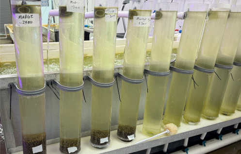 This project aims to determine how abiotic hatchery conditions, specifically temperature and light, affect bull kelp growth from the microscopic stage through to farm harvest, while also evaluating cost and energy tradeoffs. Initial hatchery trials showed that high temperatures accelerated early growth but caused juvenile sporophytes to detach before outplanting, while lower temperatures produced steadier growth with less contamination risk. Higher light levels also appeared beneficial, though data analysis is ongoing. Once seeded lines were deployed, almost all bull kelp washed off within a month, preventing harvest-level comparisons. This prompted additional investigations into environmental and hatchery-related causes of seed loss. The team is now testing whether unusual winter conditions (warmer, rainier, cloudier weather in 2024–25) or hatchery practices (low water motion and frequent GeO₂ additions) contributed to poor seed adhesion. Follow-up experiments in Kodiak are underway using varied water velocities and GeO₂ treatments to evaluate adhesion strength. Despite setbacks, early findings suggest lower hatchery temperatures (~5°C) may improve farm yields, though further replication is needed. A no-cost extension is being sought through June 2026 to repeat trials, confirm results, and strengthen conclusions about how hatchery conditions influence farm-scale bull kelp production. If successful, the project will provide kelp farmers with data-driven hatchery protocols to improve survival, yield, and cost-efficiency.