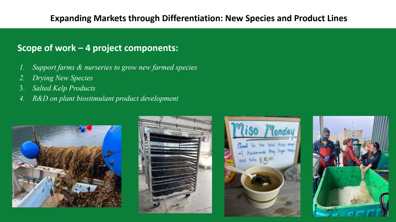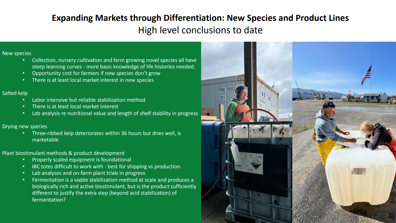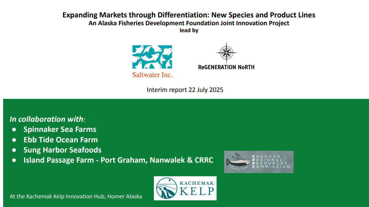 This project addresses the imbalance between Alaska’s growing supply of farmed sugar kelp and current market demand by focusing on species diversification, product differentiation, and market expansion. Building on lessons from earlier stabilization and processing trials, the work supports four farms and two nurseries in cultivating three additional kelp species, expands salting trials and product testing for gourmet and specialty food markets, and develops seaweed-based plant biostimulants for Alaska growers. By linking farming and processing innovations with differentiated products and diverse markets, the project aims to strengthen the value chain and accelerate the development of a resilient Alaska seaweed industry.
