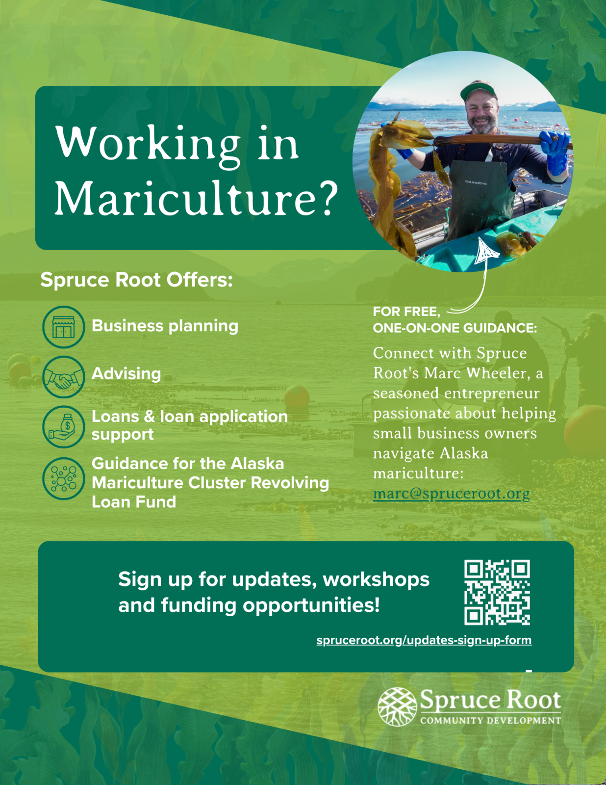 Spruce Root business planning services and technical assistance with loan applications and other queries. Click the image below to expand, or visit Spruce Root’s website for more information. Alaska Sea Grant also offers business planning services through Quentin Fong, Seafood Marketing Specialist.